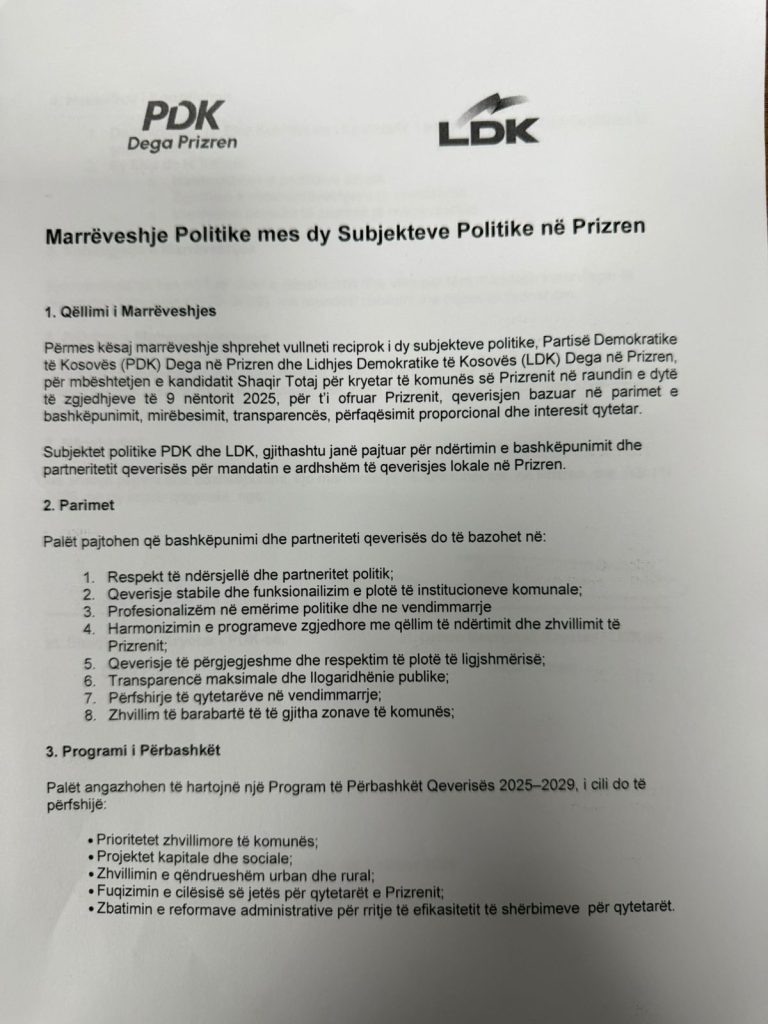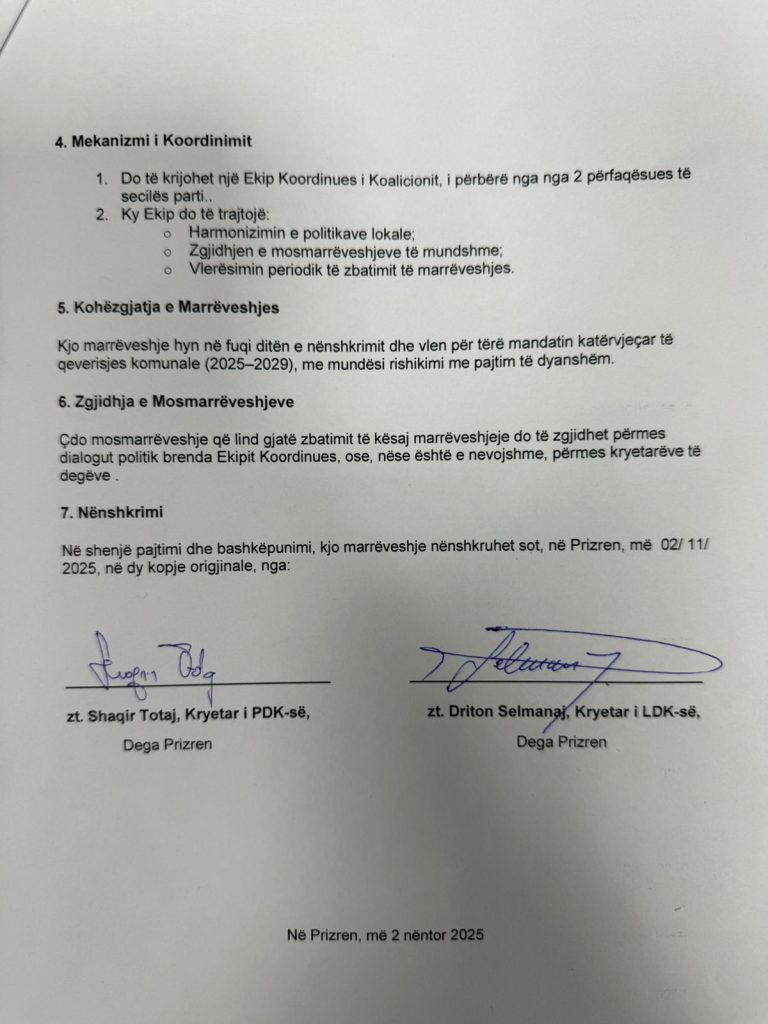 Kjo është marrëveshja mes PDK-së dhe LDK-së, e nënshkruar sot,pasdite për balotazhin e 9 nëntorit