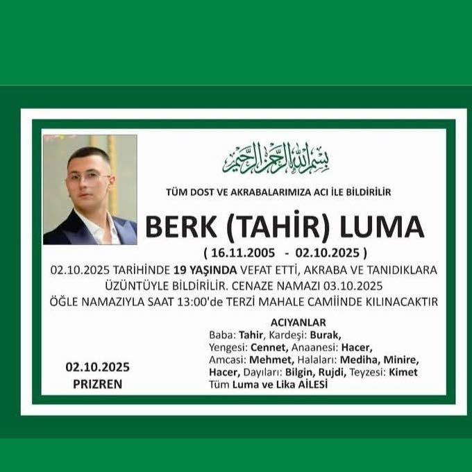 Lajm i trishtë qw ka pikëlluar prizrenas . Ka ndërruar jetë Berk Tahir LUMA, në moshën 19 vjeqare. Kjo vdekje e kwtij tw riut pos dhembjes ka pikëlluar edhe shumë prizrenas për moshën e tij kaq të re dhe sjelljen e tij shembullore si shok./QendraPress/